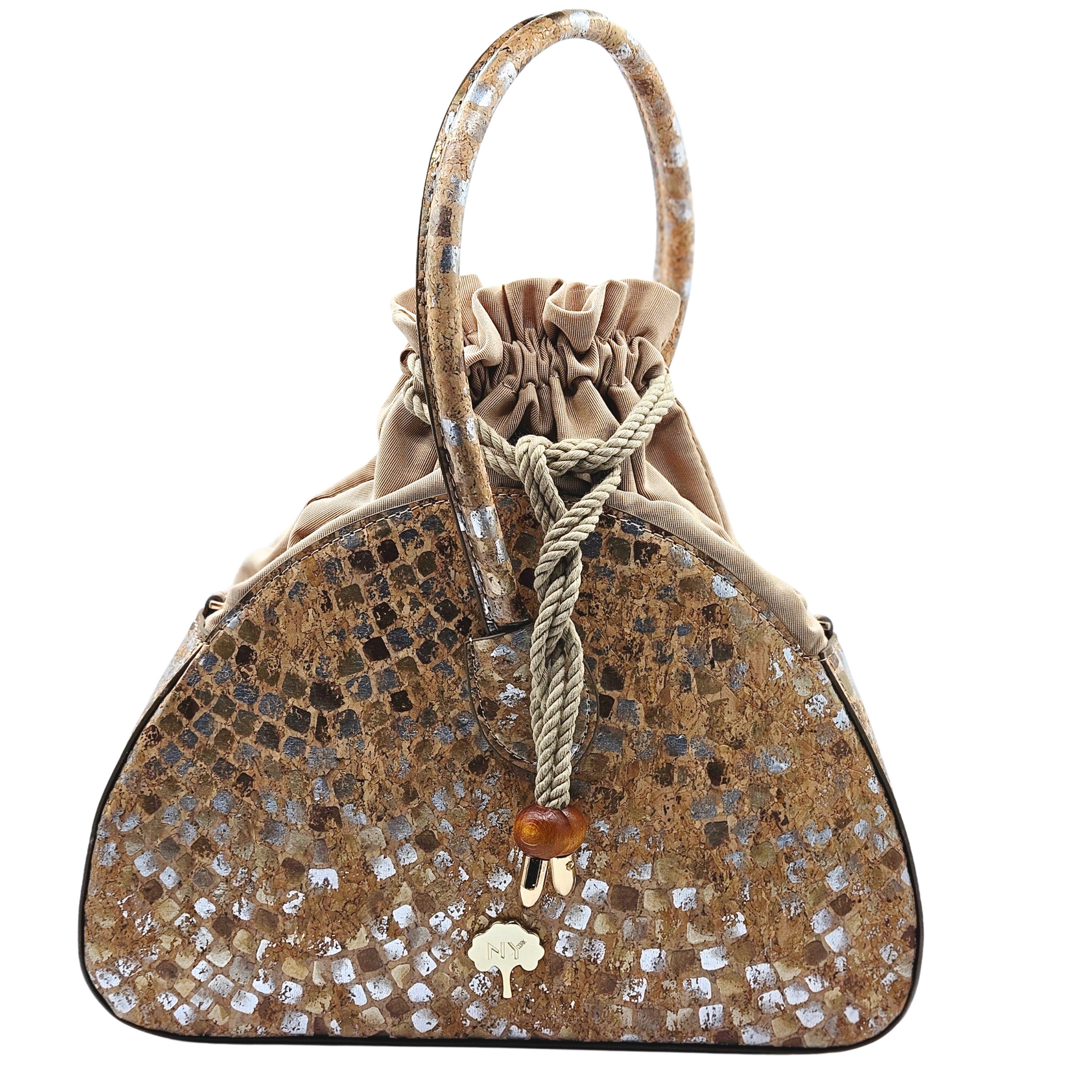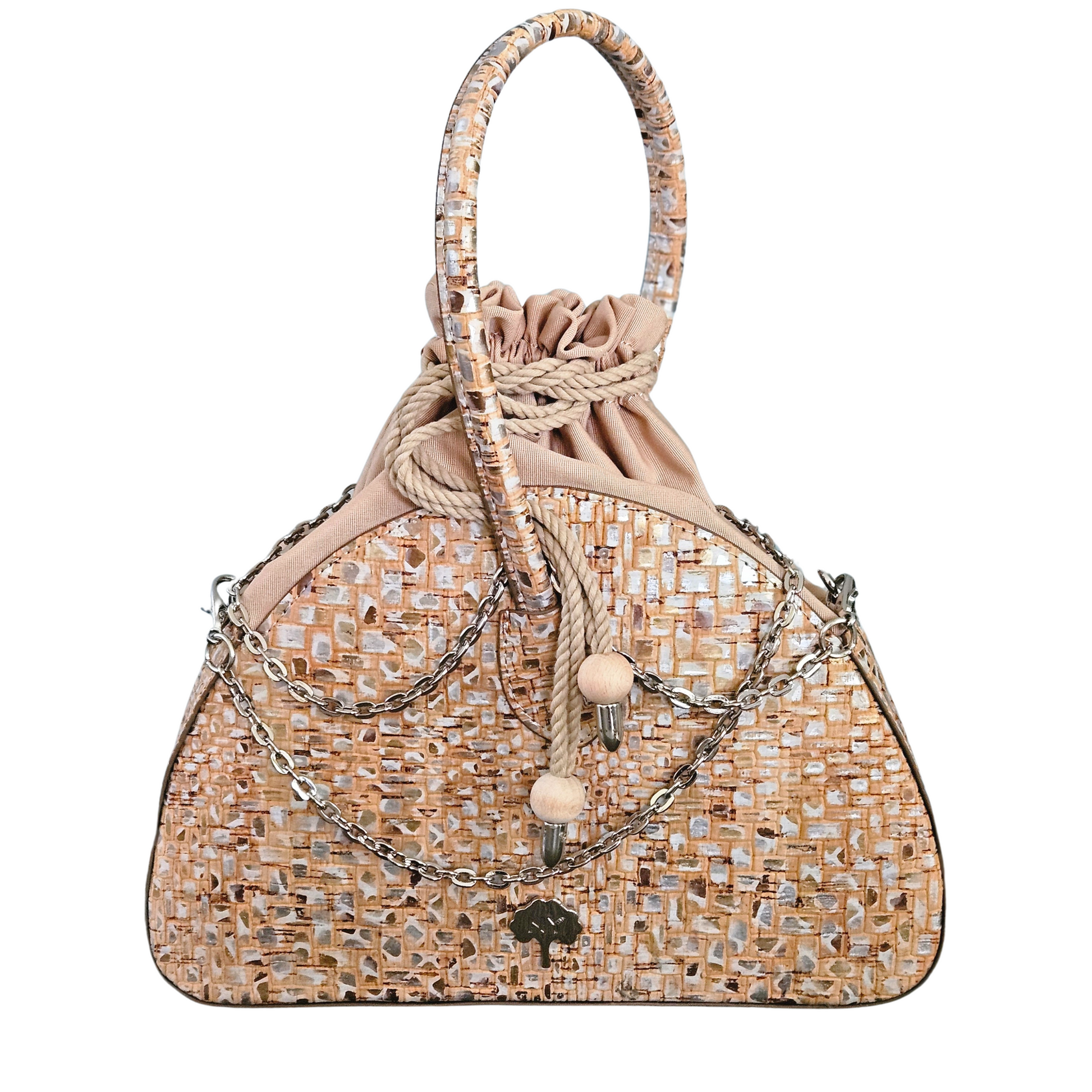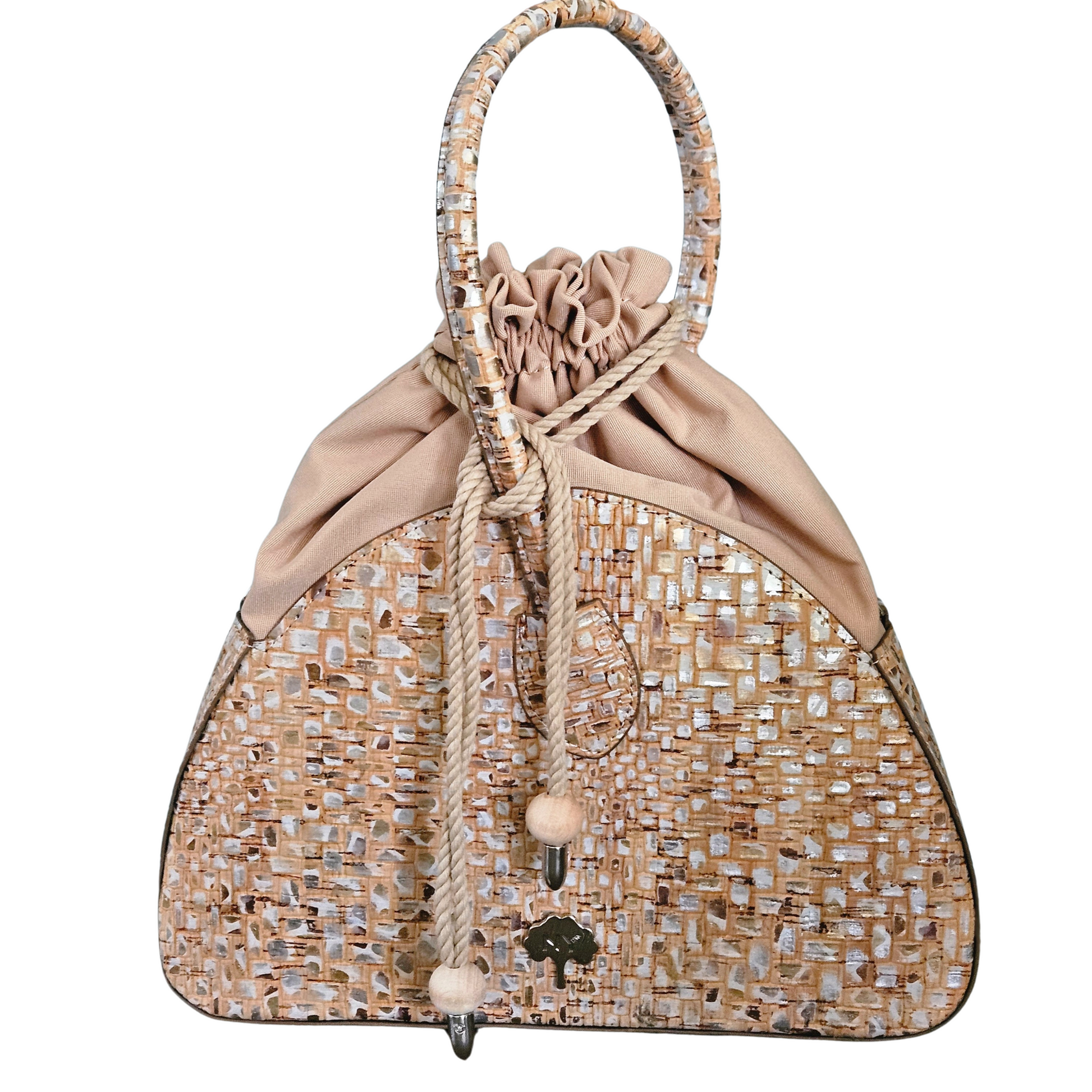 La tela de corcho está hecha de corteza de alcornoque y es un material totalmente natural, vegano y sostenible. El alcornoque deja su corteza cada 9 años y se recolecta separándolo del árbol mediante métodos especiales. Mientras se realiza este proceso, el árbol nunca se corta y este proceso no daña el árbol de ninguna manera. Por el contrario, la recolección regular del alcornoque permite prolongar la vida del árbol, que vive una media de más de 200 años. El tejido de corcho es además un tejido impermeable, ligero, suave al tacto sedoso, hipoalergénico y antibacteriano.