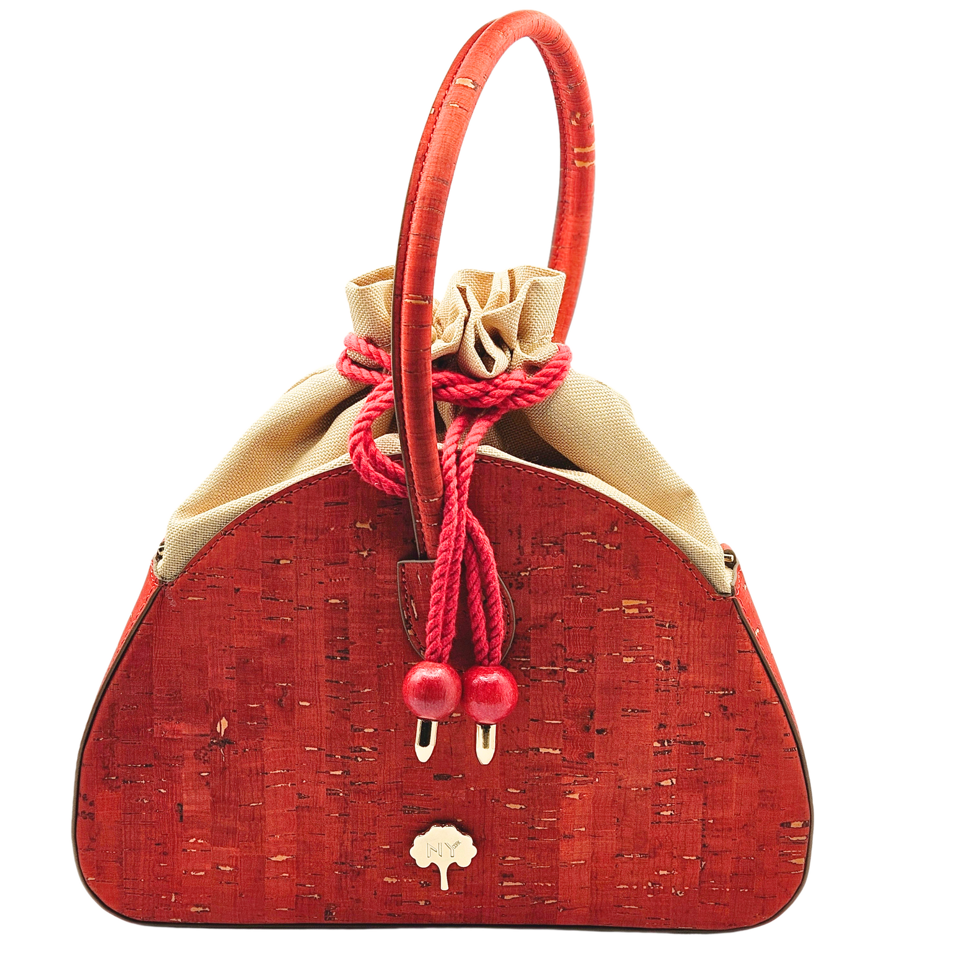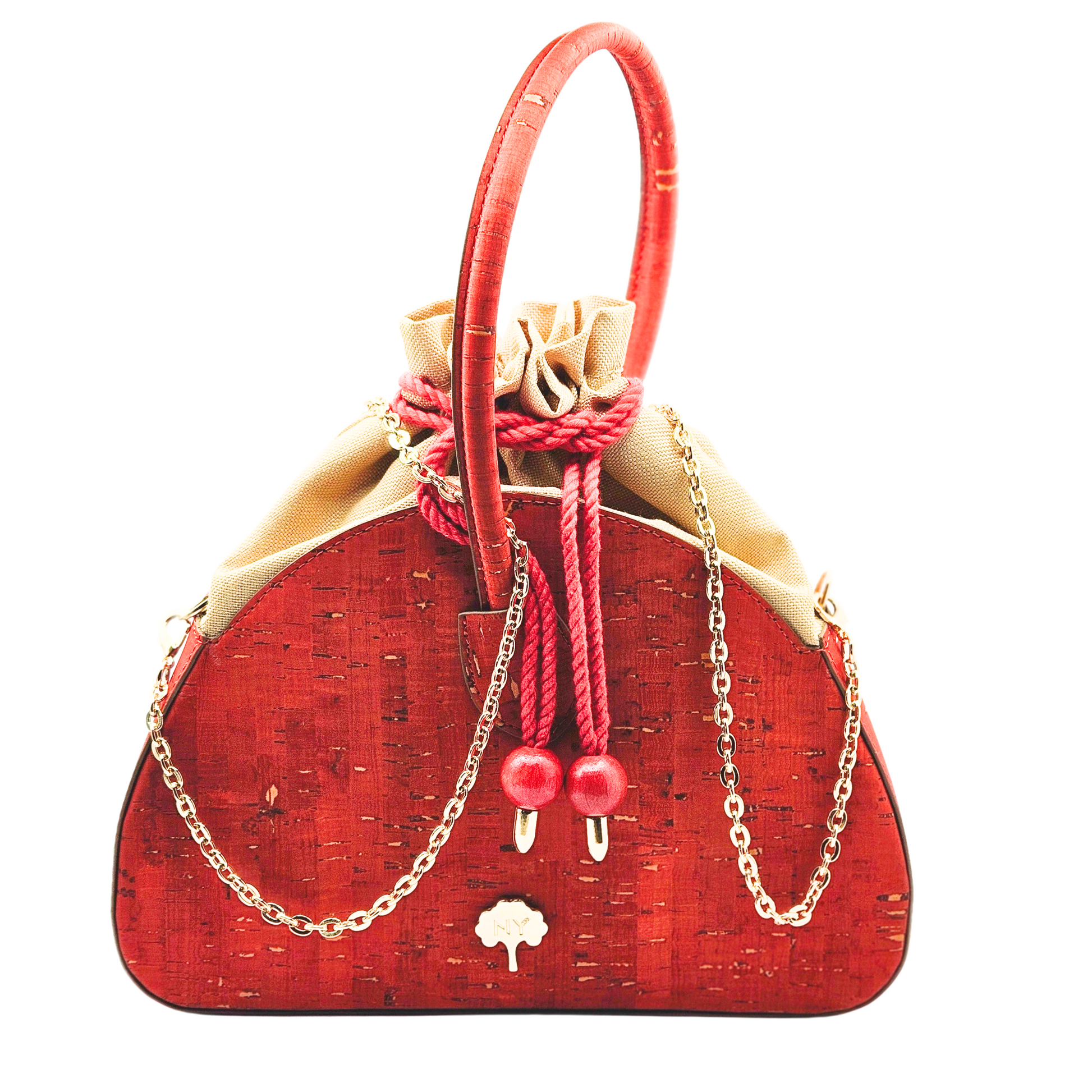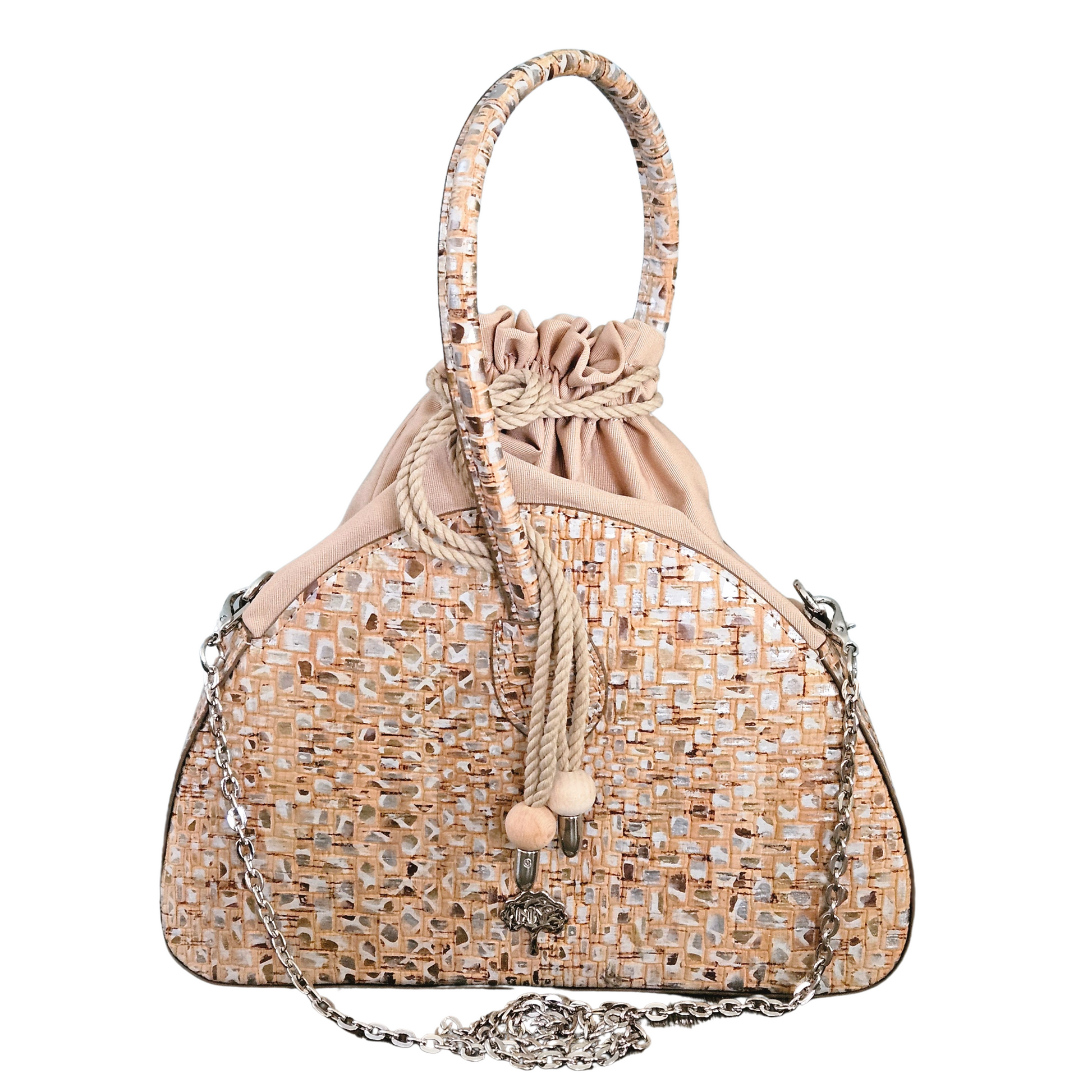 La tela de corcho está hecha de corteza de alcornoque y es un material totalmente natural, vegano y sostenible. El alcornoque deja su corteza cada 9 años y se recolecta separándolo del árbol mediante métodos especiales. Mientras se realiza este proceso, el árbol nunca se corta y este proceso no daña el árbol de ninguna manera. Por el contrario, la recolección regular del alcornoque permite prolongar la vida del árbol, que vive una media de más de 200 años. El tejido de corcho es además un tejido impermeable, ligero, suave al tacto sedoso, hipoalergénico y antibacteriano.